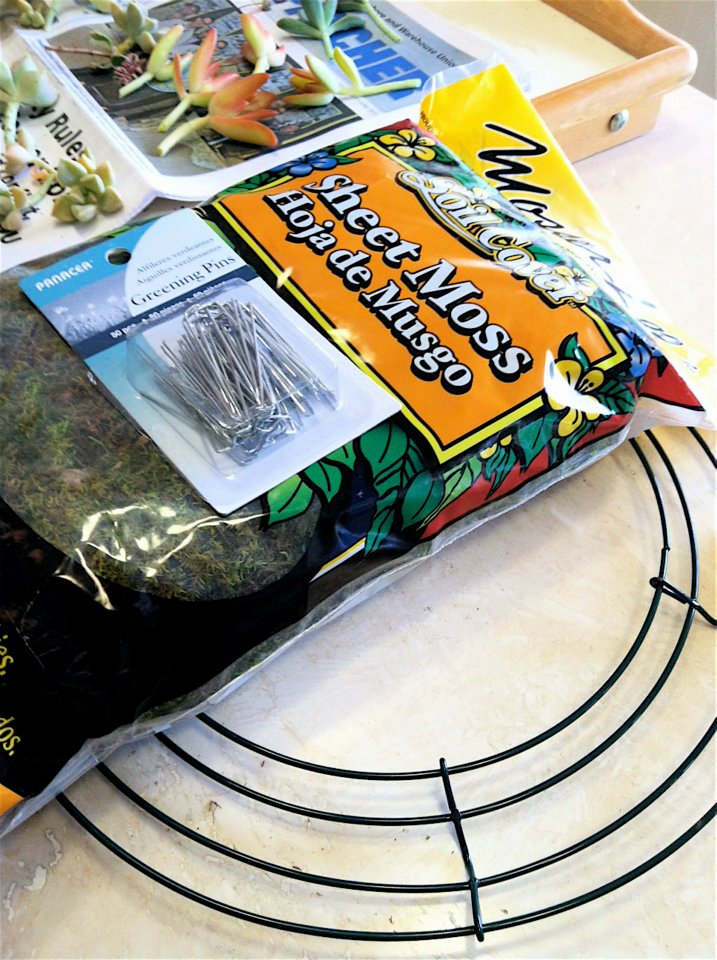Isn't BHG's wreath lovely? Just below the photo is a link to "how to make a succulent wreath". Let me tell you a few things I did differently. BHG instructs to use moss secured with netting. I thought the moss sheets with a bit of soil and wrapped with wire was much easier. Having said that, this is my first succulent wreath I have made. I will let you know how it holds up. Do check out this link, there is lots of information I did not mention. So, Pinterest pin "How to Make a Succulent Wreath", gets two thumbs up .... so far.